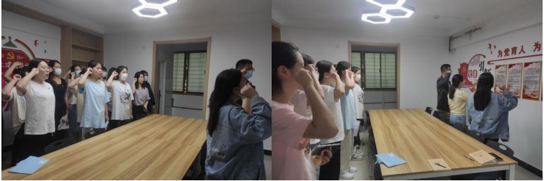 首先,何书记带领全体党员集体重温入党誓词大家高举右手,紧握右拳,面对鲜红的党旗再次庄严宣誓。铿锵有力的入党誓词坚定了青年党员的理想信念,激发了他们努力奋进的昂扬斗志。
