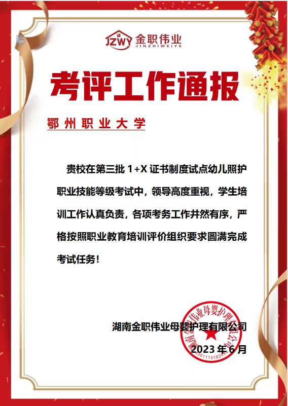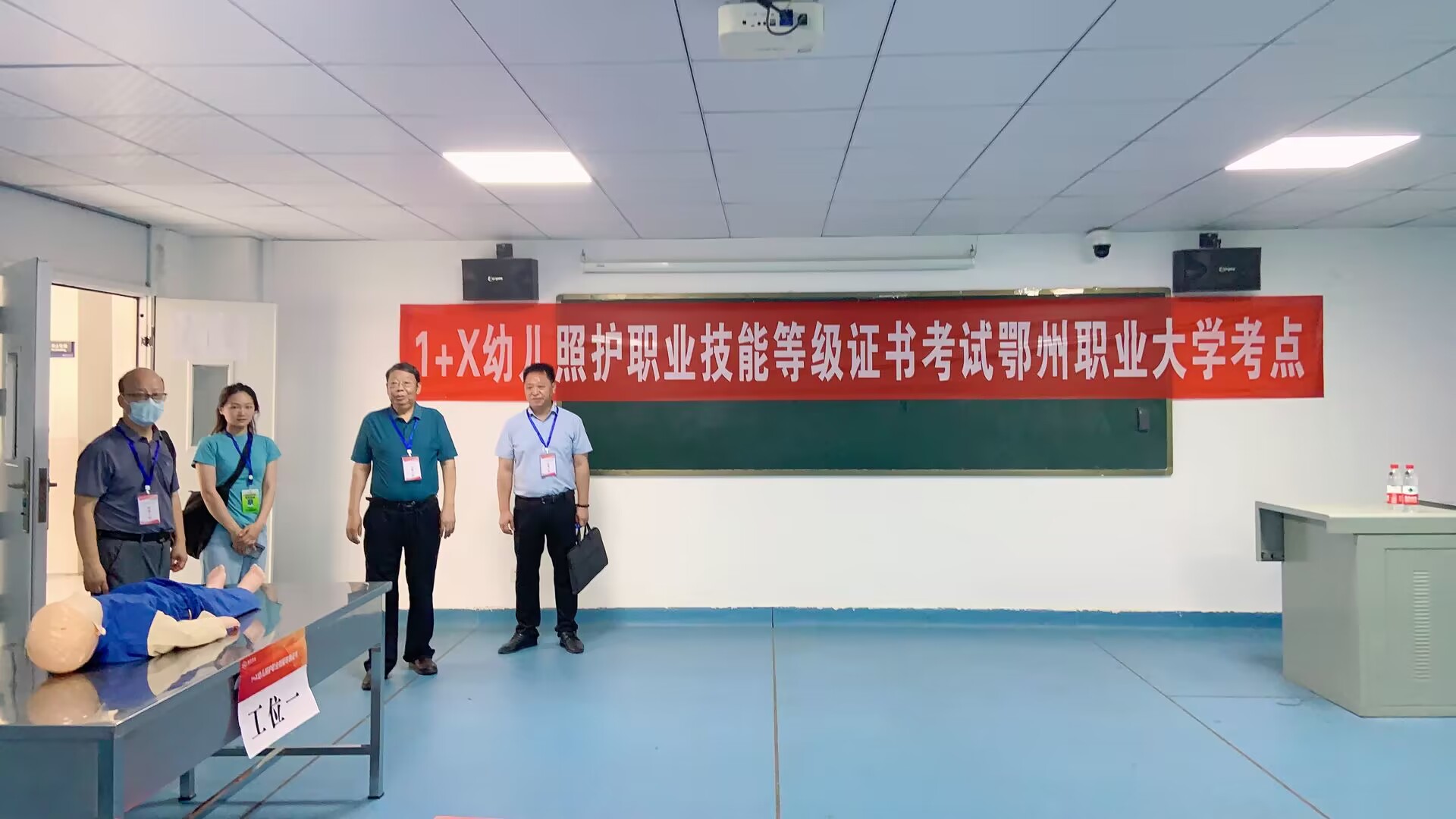 本次考核工作是在教育部1+X证书制度试点第三批、第四批职业教育培训评价组织——湖南金职伟业的指导下,由我院学前教育专业教研室具体负责,并得到了学校教务处、继续教育学院和医学院等部门的大力支持。校党委委员、副校长杨殿生,教务处负责人和我院领导到场巡视。整个考试过程井然有序,考评员、监督员认真履职尽责,考生严格按照要求操作展现了应有技能水平和专业素养。