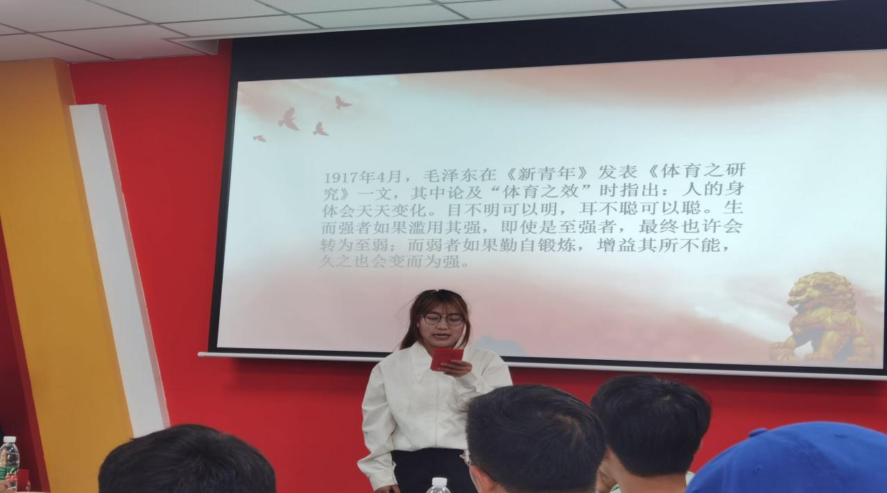 宣讲员高婧婧同学宣讲的主题是《以强健之体魄,筑强健之中国》,她以毛泽东在《新青年》中“体育之研究”一文中对强体的意义阐释以及他一生中对体育的热爱指出青年强体的重要性,同时党的二十大报告中指出加快建成体育强国的要求,强体是强国的基础,号召广大青年不仅要加强体育锻炼同时也要学习体育精神,青年是国家的未来,应用体育强健体魄筑造信念,发扬体育精神为强国助力。