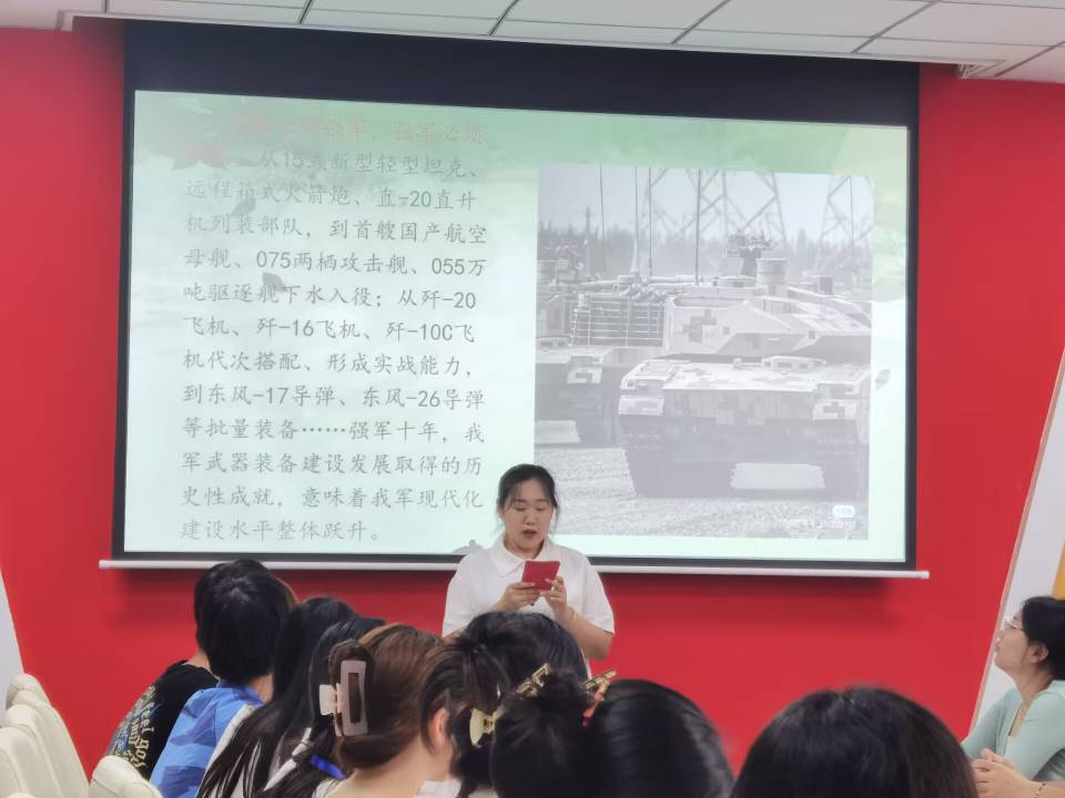 随后,宣讲员樊萌茹同学宣讲的主题是《心系国防,共筑美好家园》,她以我国的航空母舰“福建舰”“辽宁舰”“山东舰”和我国的空中力量“歼-20、歼-16、歼-10”飞机的再次搭配来介绍我国的国防武器装备发展的现代化。并指出在二十大中习近平总书记提出的强军思想和把我国军队建成世界一流军队的目标,让同学们了解了强军对国防、对国家安全、国家富强的重要性。