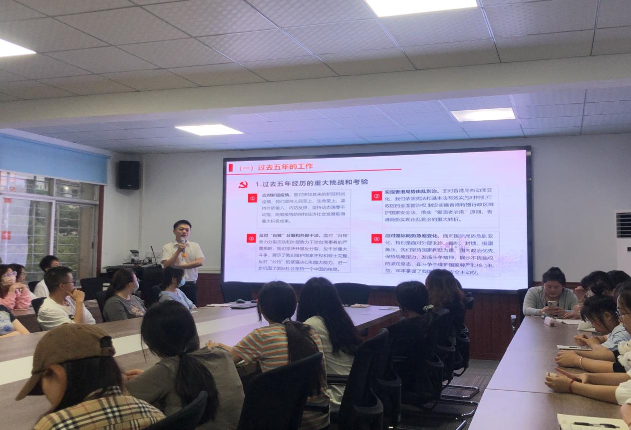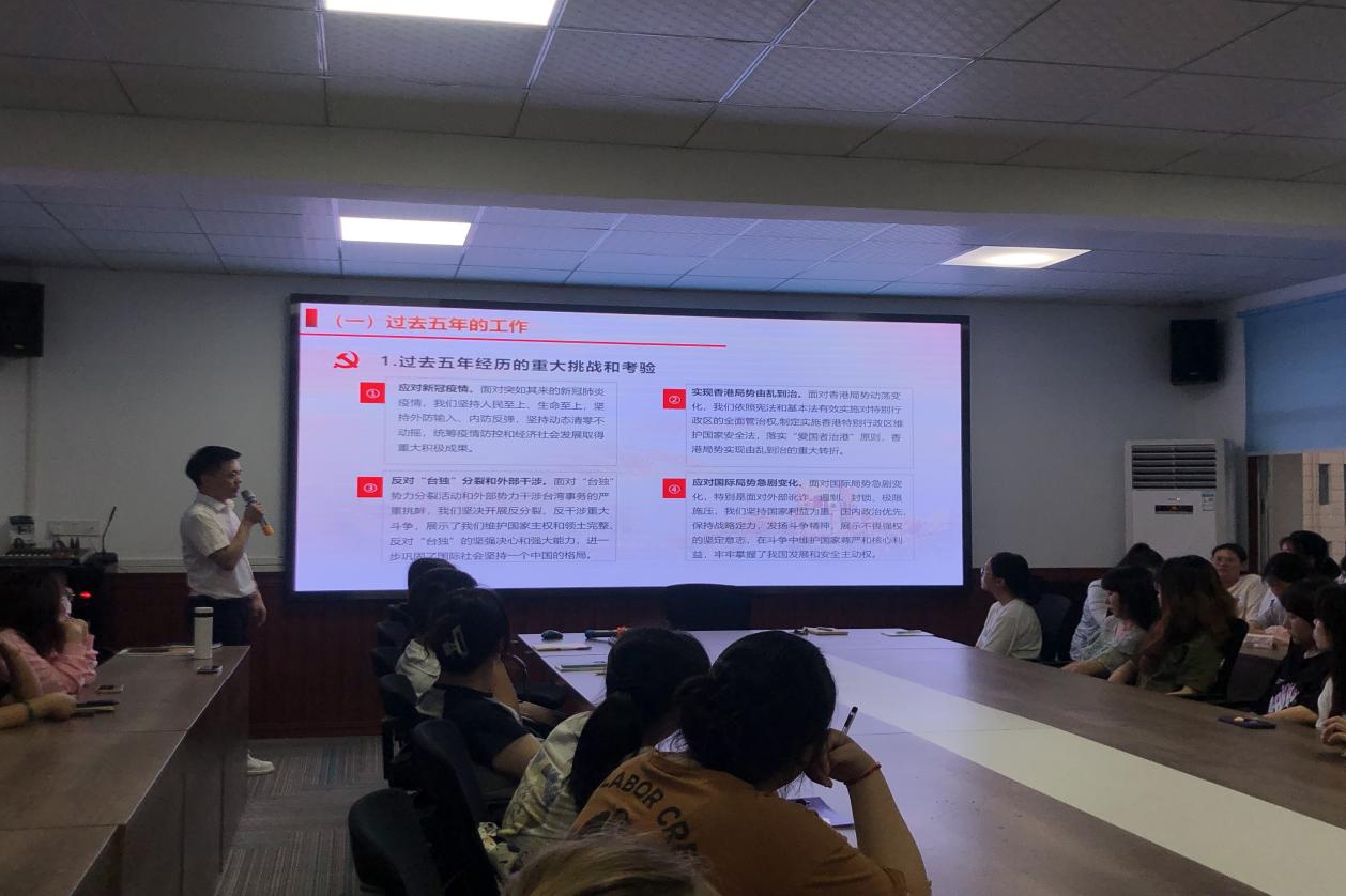 随后,袁老师带领学生们一同回顾了党的二十大的主要成果、党的二十大的主要精神、过去五年的工作等重要内容。在关于应对风险挑战方面,袁老师结合时事提到,“以斗争求安全,则安全存;以妥协,求安全,则安全亡。以斗争谋发展则发展存;以妥协谋发展,则发展衰。我们必须丢掉一切的幻想,坚持底线思维,始终做好应对最坏情况的打算。发扬斗争精神。增强斗争本领,依靠全党全国人民的意志和力量战胜一切可以预见和难以预见的风险挑战”。