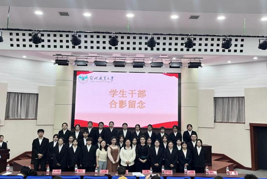 在参会同学们激烈的掌声中,领导和老师们登台与新任干部们共同合影。