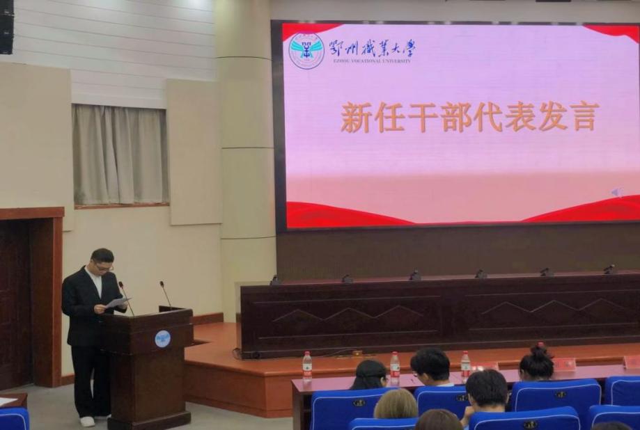 22级干部代表龚剑兵上台发言,指出宿管会工作围绕着维护宿舍的安全、卫生和秩序,在日后的工作当中,积极协调各方资源,努力为大家解决各种问题,营造一个更加美好的生活氛围。并会在接下来的时间里积极组织各类活动,促进同学们的互动与交流,增进同学们之间的友谊,培养团结协作的精神。
