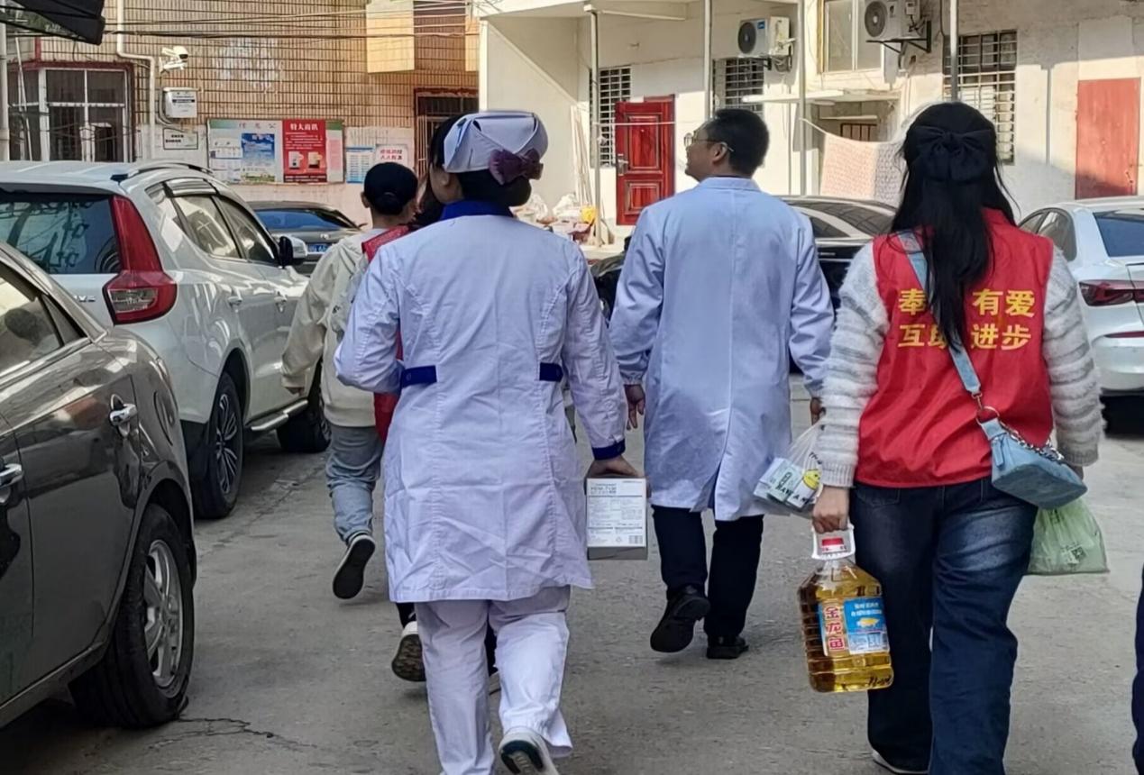 随后,志愿者们手提爱心物资与医务人员挨个前往老人的家中,并送上热烈而又诚挚的节日祝福,老人们脸上溢着幸福的笑容。在房间内,大家亲切地同老人们促膝长谈,耐心询问老人们身体状况以及生活中遇到的困难,医务人员为老人检查身体状况,根据生活方式进行健康指导时,志愿者们在一旁协助,为老人们提出的疑惑进行解答,让老人们真切感受到关怀和温暖。