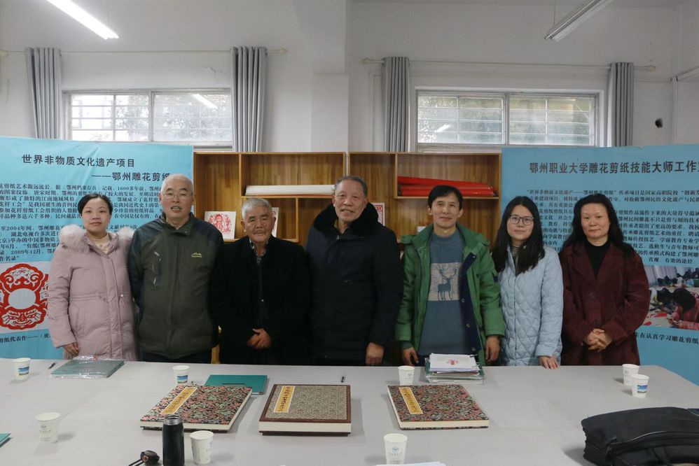 (供稿:南利君)12月4日下午,我院雕花剪纸技能大师工作室举办了一场《鄂州雕花剪纸大事记》的专题研讨会。出席研讨会的有中华文化促进会剪纸分会副会长、鄂州市雕花剪纸研究会会长曹小琴,鄂州市民间文艺家协会副主席兼秘书长余凤兰,鄂州市雕花剪纸研究会原会长黄云山,鄂州市雕花剪纸研究会艺术顾问万水清。我院陈适院长,工作室骨干成员舒德进副教授与南利君、杨舒婷、茅芮老师参加了本次活动。会议由工作室负责人张靖鸣副教授主持。