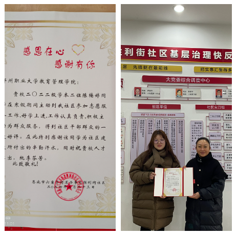 本学期初,我院收到了一封来自恩施市六角亭街道办胜利街社区的感谢信,感谢我院22级学本2班陈楠婷同学寒假期间,主动深入社区开展志愿服务。她不怕苦、不怕累,积极参与、乐于奉献,受到了社区和当地居民好评。