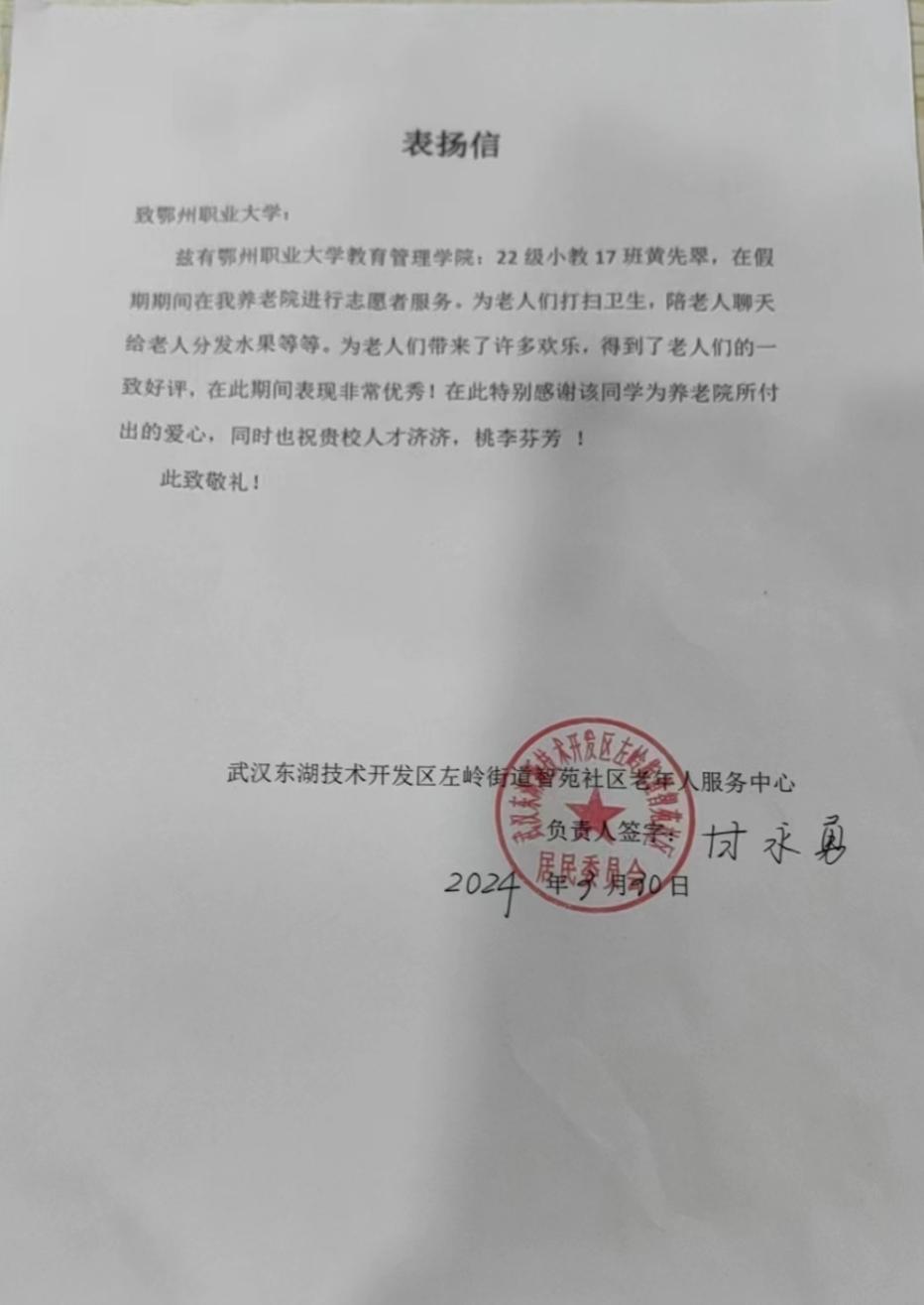 (供稿:何青)近日,鄂州职业大学教育管理学院收到来自武汉东湖技术开发区左岭街道智苑社区老年人服务中心的表扬信,高度赞扬了我院22级小教文17班黄先翠同学的突出贡献。黄先翠同学以满腔的热情和无私的奉献精神,利用周末及寒暑假时间深入社区服务中心开展志愿服务,为老年群体提供暖心服务,为老人们带来了无尽的欢乐和温暖。