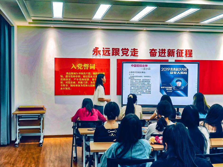 紧接着,李佳娉同学分享了“中国密码女神”王小云院士的事迹,让同学们明白密码是保障网络信息安全的核心,也是解决信息安全最可靠的手段,这次分享提高了同学们的国家安全意识,引导同学们必须时刻紧绷安全这根弦,做国家安全的自觉行动者和坚定维护者。