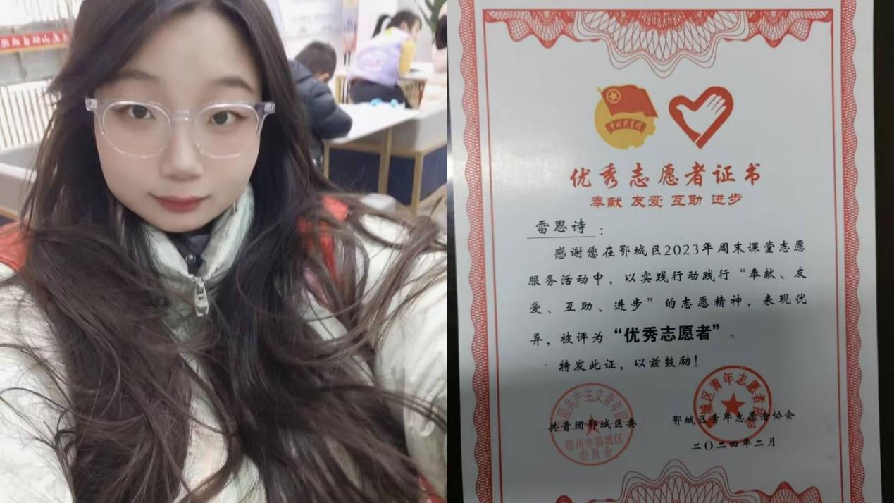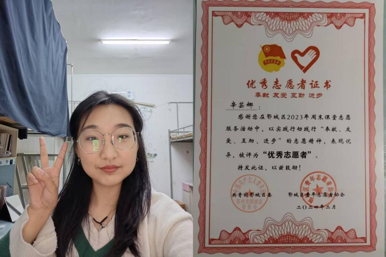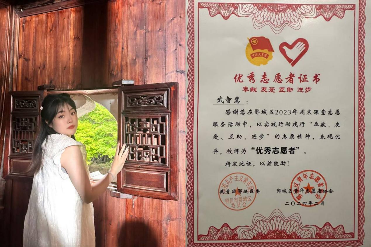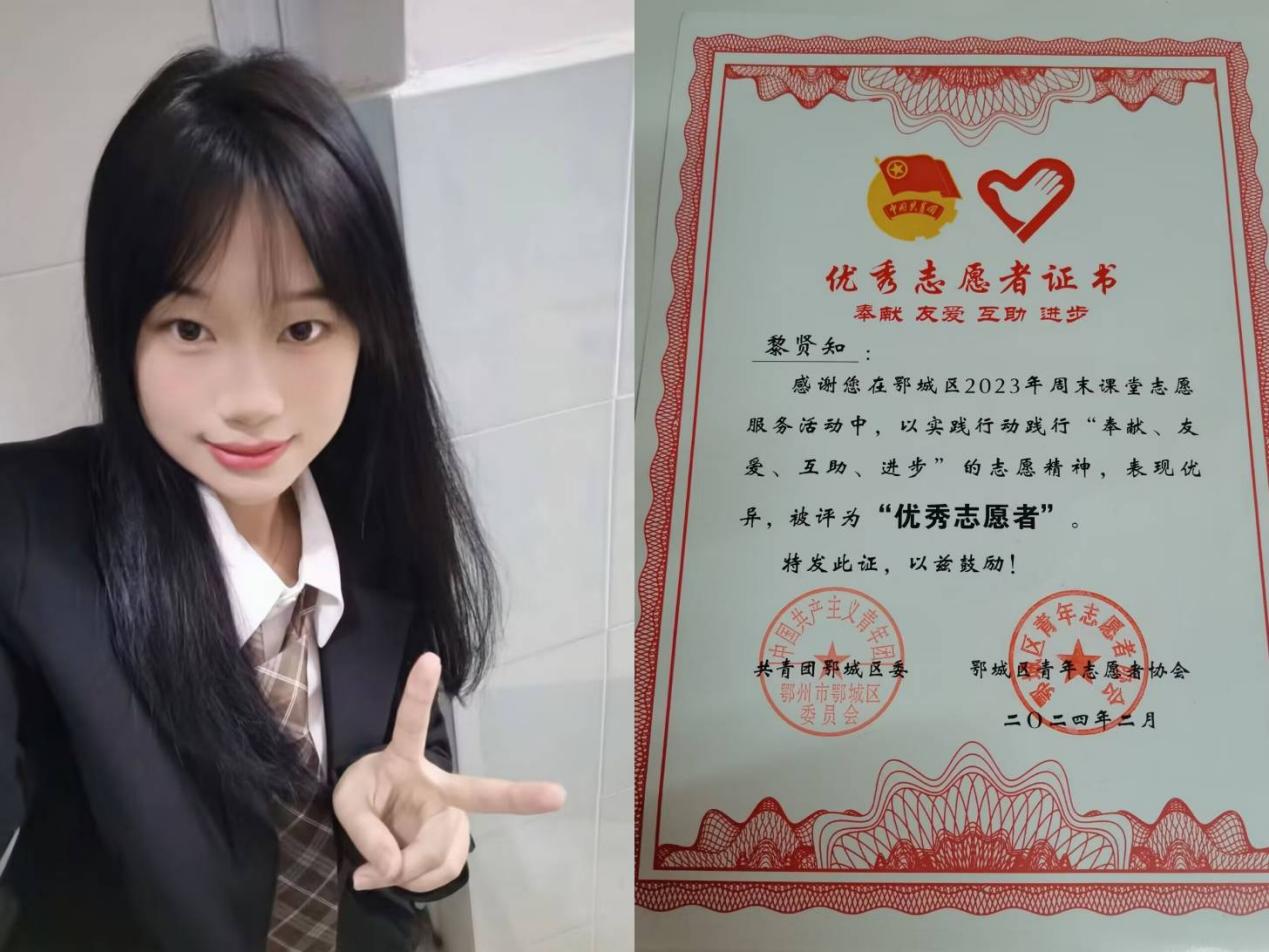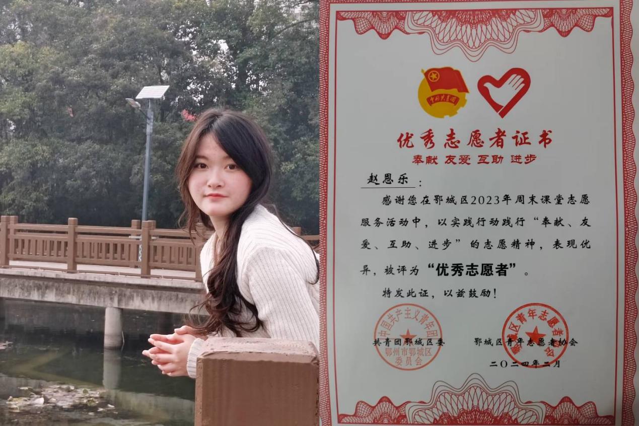 (供稿人:何青)近日,我院黎贤知、赵恩乐、雷思诗、武智慧、辛云娜等五位同学收到来自鄂城区团委寄来的“优秀志愿者”荣誉证书,对其在送“周末学堂”进社区的突出表现给与了高度肯定