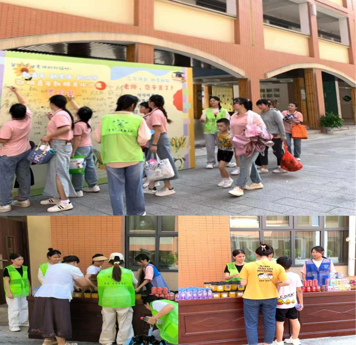 活动当天,志愿者们早早来到鄂城官柳小学,开始了紧张有序的准备工作。签到处的志愿者们始终保持着微笑,耐心地引导每一位来宾签到,并递上手中的笔。她们还负责搬运饮料,确保每位到场的老师、家长和孩子都能及时得到所需的服务。尽管搬运工作辛苦,但她们依旧保持乐观的态度,展现出了良好的服务精神。