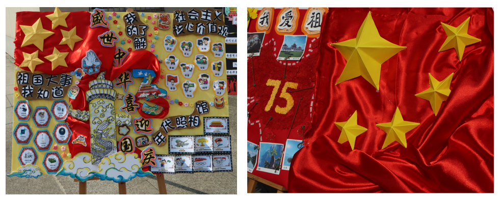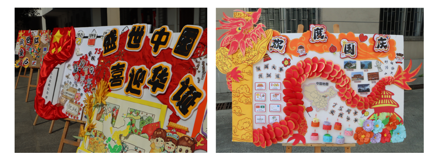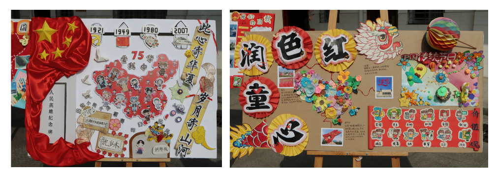 本次作品展将课程思政融入到学前专业的《幼儿园环境创设》课程中,遵循教育规律、知行合一,结合党建工作从实践出发,落实立德树人根本任务。学生们在课程中发挥主观能动性,学生们的社会责任感和使命感得到了进一步的深化和增强。在环创教室创作了“祝祖国母七十五周年生日快乐”的环创主题墙。一幅幅精美的主题墙,一段段感人的文字,生动的展示了祖国的壮丽山河和辉煌成就,激发了在场每一位同学的爱国情怀和民族自豪感。
