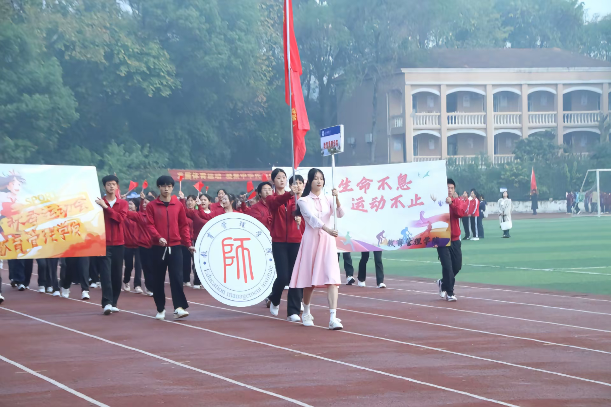 伴随着激昂的运动员进行曲,各个方阵按照顺序步入会场。其中,教育管理学院的方阵尤为引人注目,同学们身着统一的服装,步伐整齐划一,充满活力,他们以响亮的口号“教管风采,激情四溢;奋力拼搏,光彩夺目”表达了自己的决心与信念。青春的脸庞上洋溢着笑容,眼神中流露出对运动的热爱和对未来的美好期待,生动展现了教管学子积极向上、勇于追梦的精神风貌。