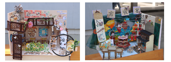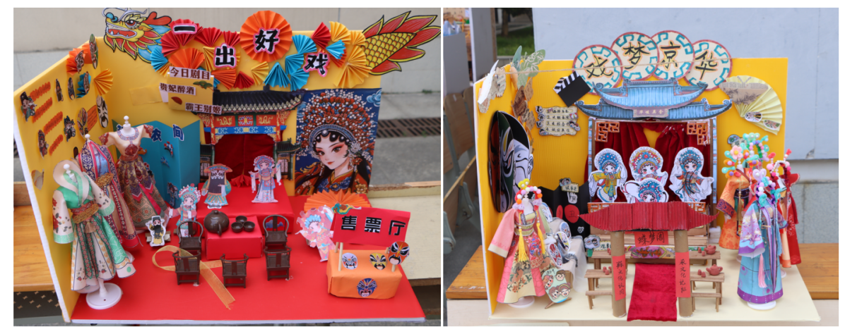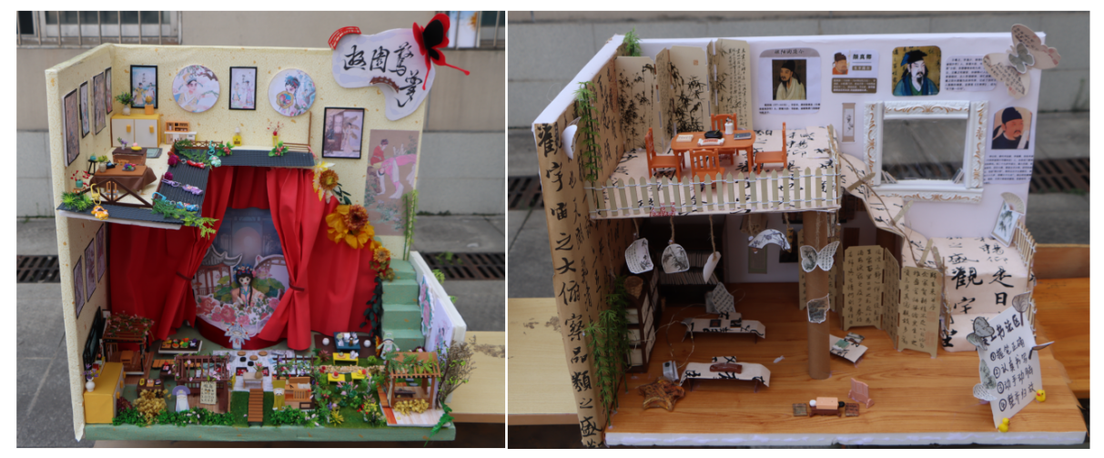展览作品精彩纷呈。从宁静致远的亭台楼阁,到柔情雅致的闺房私塾,一砖一瓦、一桌一椅,每一处细节都精心雕琢,将传统文化的韵味诠释得恰到好处。手工制作的传统服饰人偶,身着绚丽华裳,一针一线勾勒出精致的纹理与图案,细腻的设计让古典之美跃然而出。更有以京剧脸谱的鲜明色彩与独特造型、诗词歌赋的深邃意境为灵感创作的手工艺品,将传统元素与现代创意完美融合,这些作品不仅能展现学生的专业能力,更为幼儿教育注入传统文化的魅力,为环境创设注入了新的灵感与活力。”前来参观的师生们对这些作品赞不绝口。一位同学感慨道:“没想到传统文化和幼儿环境创设能结合得这么巧妙,既美观又富有教育意义,简直太精彩了!”