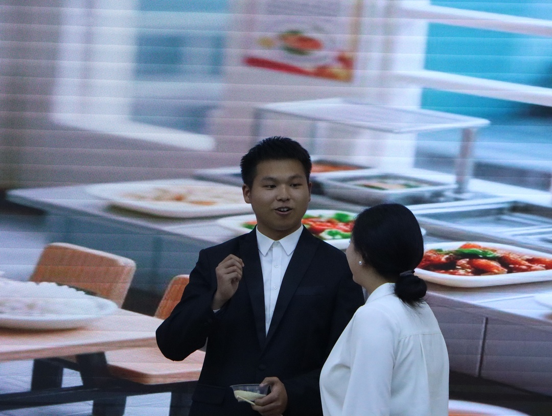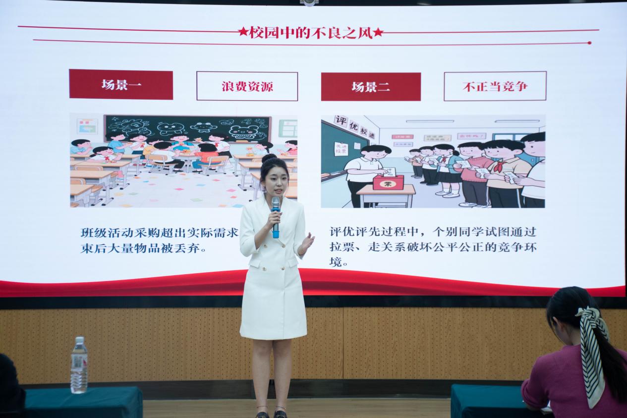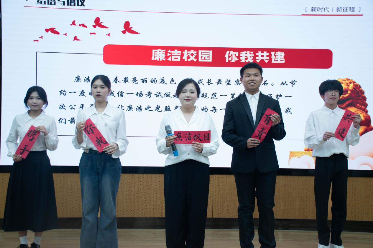 李欣颖改编歌曲《我还是从前那个少年》,以“廉洁誓言,整整回荡了这些年”的歌词引发共鸣,并结合校园平面图讲述节能与“光盘行动”的故事;唐凯引用范仲淹、于谦等古代贤人的廉洁事迹,将其与校园诚信考试、学生干部履职相联系;林美汝等同学通过情景剧展现食堂浪费劝阻、班干部竞选纠偏等场景,展示了廉洁就在日常细节中。最后,成员们以“廉洁校园 你我有责 携手共建”的书法对联发出倡议。