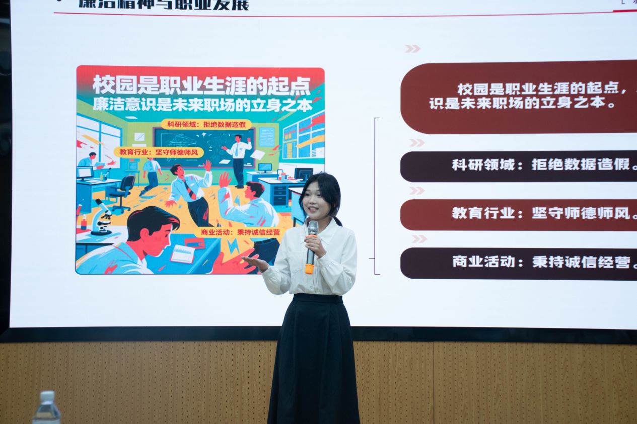 王梦琪以“廉洁如同职场GPS”作喻,强调廉洁对职业发展的导航作用;赵丁黎回溯包拯、于谦的故事,结合新时代科研、商业等领域廉洁要求,展示精神传承;雷栋根据《2024年职场廉洁调研报告》的数据指出,“70%因违反廉洁纪律被辞退的职场新人问题发生在入职前三年”,并结合报销造假、商业泄密等案例敲响警钟;袁子怡分享从学科竞赛、经费管理等校园“微习惯”培育廉洁意识的方法。程慧朗诵原创廉洁诗歌后,全组庄严承诺,将活动氛围推向高潮。