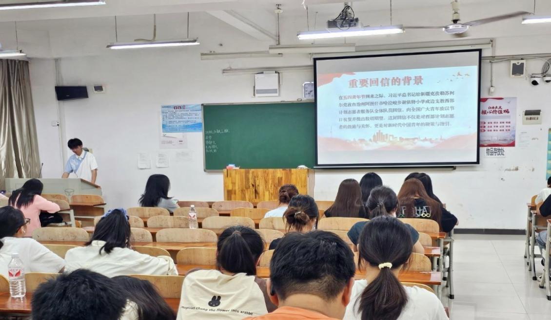 各班团支书介绍了习近平总书记回信的背景。五四青年节前夕,总书记给新疆阿图什市谢依特小学戍边支教西部计划志愿者服务队回信,既是对他们的肯定,也寄托了对全国青年的期望。随后,同学们认真学习回信精神的核心内容,并结合自身实际展开思考。团支书勉励大家坚定理想信念,厚植家国情怀,练就过硬本领,到祖国和人民最需要的地方贡献力量。