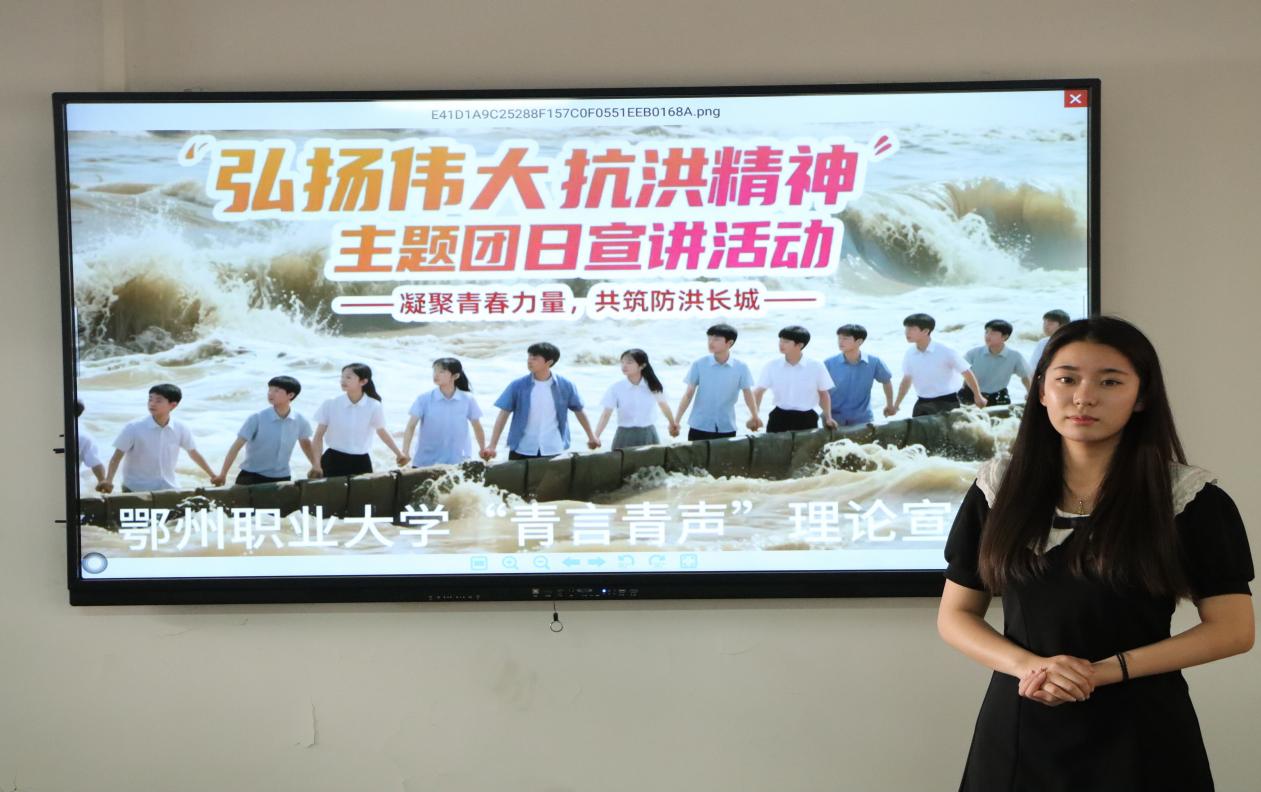 (通讯员 何青 钦玉泽 摄影 马舂霞)为深入学习贯彻伟大抗洪精神,引导团员青年厚植家国情怀、勇担时代使命,2025年6月16日下午,在鄂州职业大学教管学院组织开展的“传承抗洪精神,彰显青春担当”主题团日活动中,“青言青声”学生理论宣讲团面向全体团员青年开展了一场抗洪精神专题理论宣讲。本次活动由“灯塔”名班主任工作室指导,通过沉浸式讲述与互动交流,引导广大团员青年铭记历史、赓续精神、砥砺前行,切实增强了青年学生的责任感、使命感和集体荣誉感。
