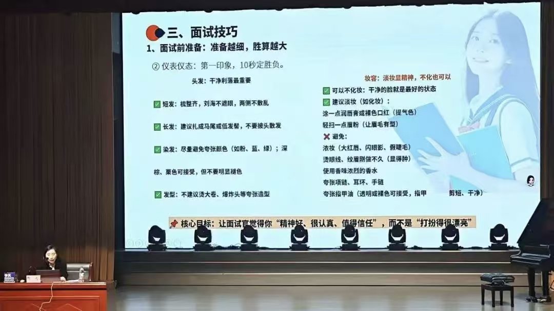 交流中,何青老师结合多年从事学生就业指导工作的经验,围绕求职心理、求职技能和赴岗实习三个方面展开分享。她首先引导同学们理性看待当前就业形势,调整心态,避免陷入盲目焦虑或消极等待;随后聚焦简历撰写、信息获取、面试表达等关键环节,通过具体案例剖析常见误区,并现场展示了几份具有代表性的简历样本,帮助大家直观理解“简洁、真实、有针对性”的制作原则;在谈到实习时,她特别强调:“实习不仅是完成学业要求,更是了解行业、积累经验、明确方向的重要过程”,并结合自己带队实习的经历,提醒同学们在实践中主动观察、勤于思考、善于沟通,把每一次锻炼都转化为成长的契机。