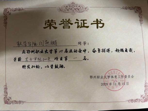 校内赛场竞风流。11月14日鄂州职业大学第29届运动会上,闫燕鹏更是多点开花。400米项目中,他凭借强劲速度与耐力一路领先,勇夺冠军;100米短跑赛场,他爆发力拉满,斩获第四名;4×100米男女混合接力赛中,他与队友同心协力,最终夺得第二名,用实力诠释了青春拼搏的力量。