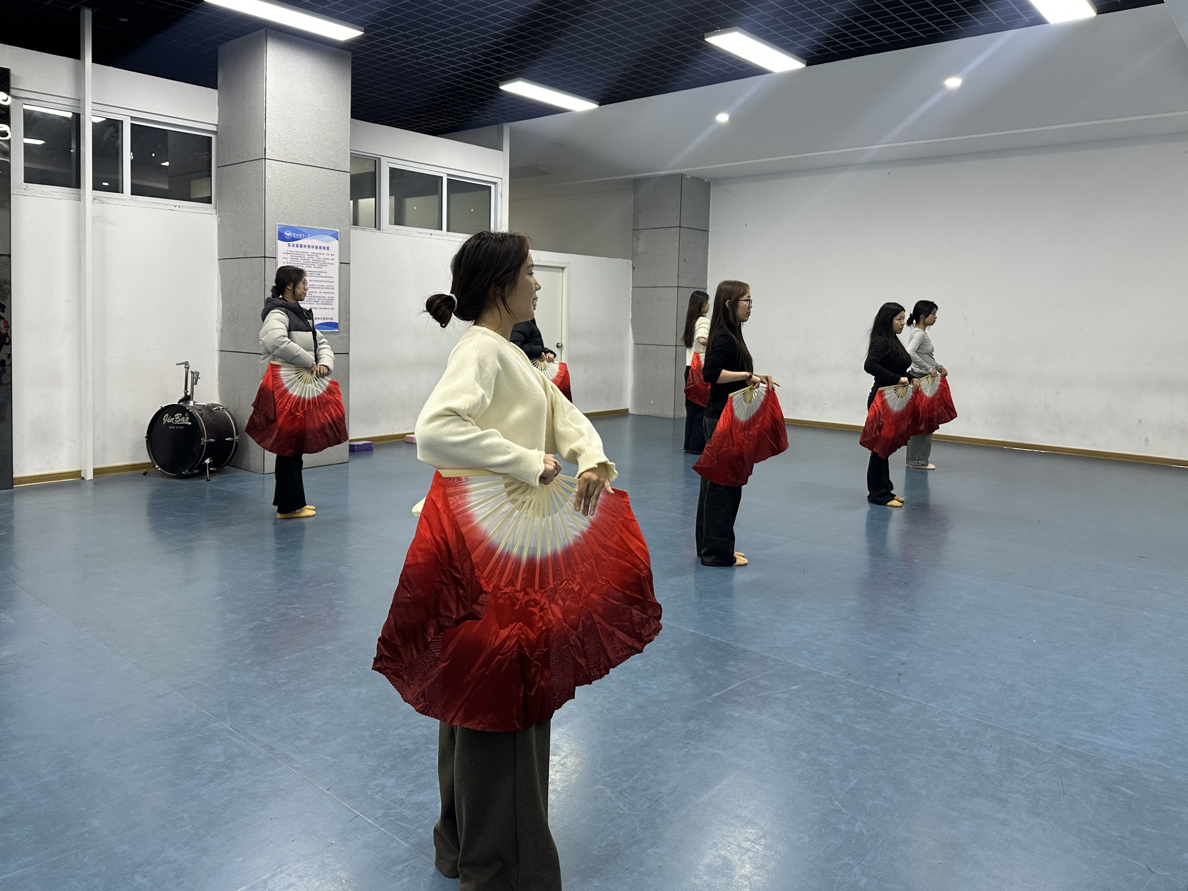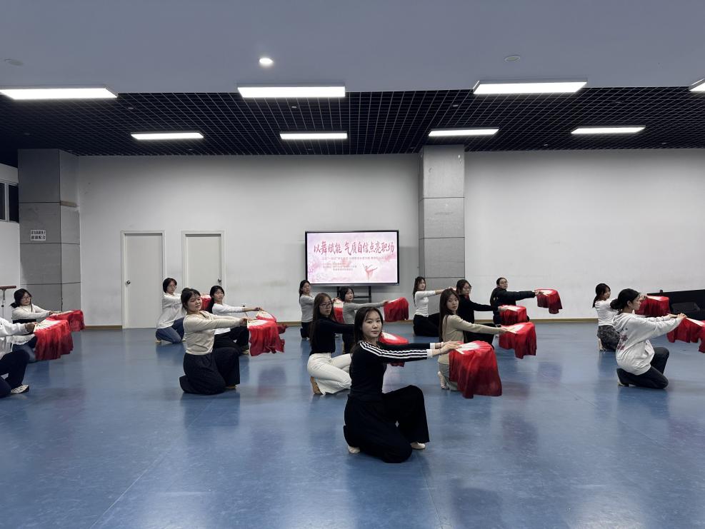 训练现场,学员们手持红白渐变绸扇,或舒展如花绽放,或收拢似水流云,动作整齐而富有韵律。背景墙上“以舞赋能 气质自信点亮职场”的标语,点明了本次课程的深层目标——不仅提升舞蹈技艺,更通过形体训练涵养仪态、锤炼气质、增强自信。