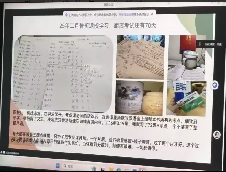 讲座伊始,郑张学姐以真挚坦诚的态度,讲述了自己坎坷却励志的备考历程。去年离校后,她先在家乡图书馆自主备考,11 月底进入培训机构全力冲刺,不料仅十天后便因租房意外导致骨折,被迫回家休养一个月。“那段时间是备考中最焦虑的阶段,” 学姐回忆道,“年后重返培训机构时,距离考试仅剩 70 多天,之前的学习节奏被完全打乱,几乎要从头再来。” 更令人动容的是,今年二月,她带着尚未痊愈的腿伤毅然返校,面对紧迫的时间节点,她选择背水一战。借助 “艾宾浩斯遗忘曲线记忆法”,在短短一个多月内,将《汉语言文学》教材中的所有核心考点,包括名词解释、简答、填空等内容逐字逐句默写八遍,累积笔记达 72 页。“那段日子常常学习到凌晨三四点,” 学姐坦言,“高强度的备考让我后来患上重感冒,嗓子哑了近两个月,但当看到理想的录取结果时,所有的辛苦和付出都有了圆满的回报。” 郑张学姐带着伤痛坚守的励志故事,深深打动了每一位线上线下的听众。