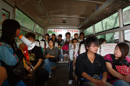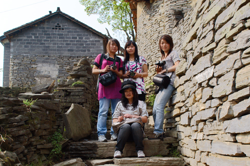 早上7点半我们就出发了,导游是位90年代的苗家小姑娘我们称她“猫猫”,活泼开朗。上了车时,同学特别闹腾,疯死了,还和猫猫开玩笑,把她给吓着了,不愿带我们,说我们太调皮了,呵。后来她发现我们这特殊团队的可爱后,都舍不得请我们吃“牛肉干”(苗语“再见”的意思)了。她教了我们一些简单的苗语,“麻姑肉”是你们好,“南纬”是谢谢,美女是“阿雅”,帅哥是“点菜”,再见是“牛肉干”、、、、、有意思吧。还教我们唱山歌,苗家山歌一个调,不过很好听,同学都学的很认真,一路的欢笑,一车的歌声,很有感觉,心情很放松。虽然有45分钟的车程,但都欢歌笑语中,我们很快就到达了目的地。