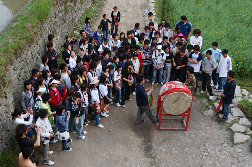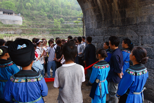 进苗寨可不是那么容易的事,要经过三大坎。首先是击鼓,击的好才能过关,第二坎就是喝苗家酿制的糯米酒,甜甜的,很好喝,每个人一碗,最后一坎就是对歌了,村民门在村口站着和我们对歌,对了好半天终于让我们进寨。