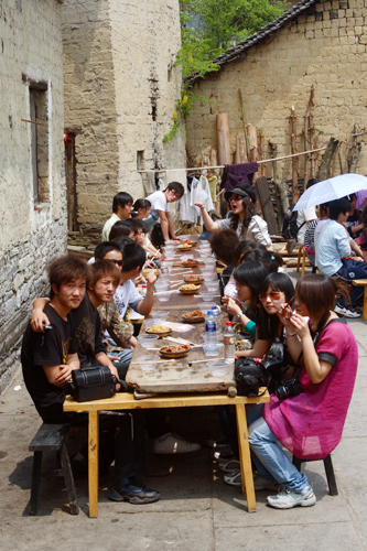 中餐吃的是“龙门席”,听起来有气势吧。苗家每有大事办酒请客,就把自家的门板卸下在院子里排成长条,把菜端在上面吃,即为“龙门席”。菜有湘西特色的血粑鸭,酸鱼,还有一些青菜,这都是他们过年才吃的菜呢,晒着太阳,吃着辣的,喝着小酒,就是他们的特点,我都是带着帽子吃饭的,太阳好大,我都被烤熟可以吃了。