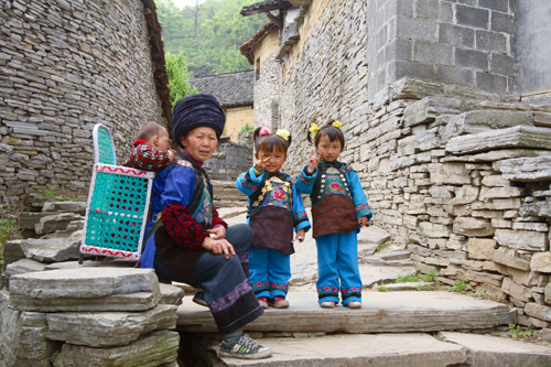 这里的房子都是砖头的,很古朴,山路很迂回,村民很淳朴。我们参观了寨子里的建筑和当地的民风民俗。有几个小女孩很可爱,穿着个小苗服,看到我们就唱山歌,来表示欢迎我们。唱的是苗语,都听不懂,但是声音很清澈,稚嫩,很具感染力。其中一个小女孩好漂亮,笑起来很甜美,还和她合了影。好喜欢~~!
