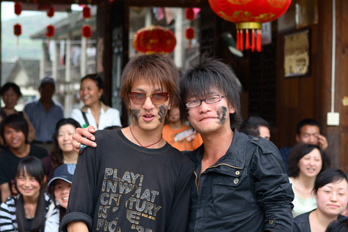板鞋比赛,我班男生拿了第一。老师说奖品就是苗族姑娘的特别礼物,搞的男生都心花怒放的。阿雅叫他们把眼睛闭着,把手伸着。给他们一人个手链,而且还把每个人脸上都抹了一脸的锅底灰.哈、、、、、、
