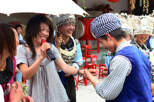 还有互动活动,首先是赶边边场,这是苗族青年求爱的一种方式,先对歌,然后阿哥看上阿妹就拉她的衣服,阿妹看上阿哥就踩他的脚,踩的越重,就表示越喜欢。最后互送礼物。这个赶边边场赶的很野蛮,呵。游客们最后还得到了阿雅点菜送的礼物。