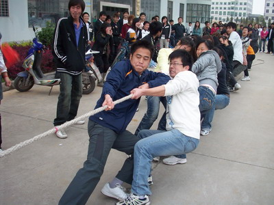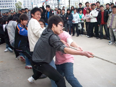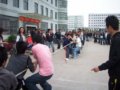 2009年3月31日下午4:20,在3号教学楼前,我院首届“女生节”系列活动——男女混合拔河比赛顺利举行,来自08级的道桥、自考、测量、环艺、旅游、室内、房产、物业、建工等共9个专业的同学组成了7支队伍参加了比赛。其中由于班上的女同学人数有限,道桥、自考、测量三个专业联合组成了一支队伍。比赛场面激烈异常,呼喊声,加油声,此起彼伏,不绝于耳。经过一个多小时紧张激烈的角逐,最后由旅游专业的代表队摘得了本次拔河比赛的桂冠。此次比赛既丰富了同学们的校园文化生活,也锻炼了同学们的身体,同时还体现出我院男女同学互帮互助,团结一致的良好风貌,更将同学们的青春风采展现的淋漓尽致。