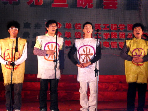 带着常务副院长熊汉锋的祝福、迎着在场观众的期盼,由建工学院邱代来老手献唱的一首大气磅礴的歌曲《精忠报国》萦绕在每一位观众的耳旁,动作表演和歌声的配合把整个节目诠释的淋漓尽致。双人舞《网恋》展示了情系于现实生活中的网络情缘,小品《恋爱治疗》以风趣幽默、搞笑滑稽的表扬方式充分反映了当代大学生中的普遍现象,贴近学生生活主题。二胡演奏《赛马》其丰富的内涵给了在场每一位嘉宾以心灵的震撼,老艺术家徐年生老师的演奏获得了全场经久不息的掌声。接下来的双簧、模特走秀、歌曲串烧、街舞更是给了在场观众一个意外的惊喜。舞蹈《扬帆》把整场晚会推向了高潮,舞蹈展示的是下岗职工再次入岗的艰辛,寓示着我院教师不抛弃、不放弃任何一名同学,尽全力帮助其进步。最后晚会在全体演员合唱的《难忘今宵》中圆满落下了帷幕。