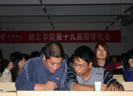 我院第十九届团代会暨学代会顺利召开 2011年10月21日十四时许,我院第十九届团代会暨学代会在3号教学楼C501隆重召开。我院常务副院长熊汉峰、党总支书记陈永红、副院长黄世宽、办公室主任邓桃莉、团总支书记潘世超及院学生支部书记毛仁兵出席了本次大会。 大会在庄严的《国歌》中隆重开幕。团总支书记潘世超致开幕词,常务副院长熊汉峰代表学院对大会的召开表示祝贺。随后,72名候选人一一上台发表演讲,大会在紧张而又激烈的氛围中进行着。本次大会以我院各班的团代表、班委代表及优秀学生代表为选民,本着公平、公正、公开的原则,推选出乐于服务于广大师生的学生会干部。经过六个多小时激烈角逐,其中的47名候选人脱颖而出。 最后,院党总支书记陈永红致词,对新一届的团总支学生会干部成员表示祝贺,并对他们提出了要求和希望,希望他们戒浮戒躁,团结一致,再接再厉,让第十九届团总支学生会再创辉煌。 至此,我院第十九届团代会暨学代会圆满落下了帷幕。 (文:何志巍 图:任俊强)