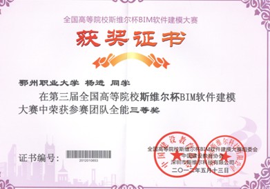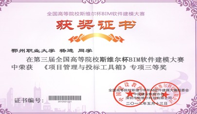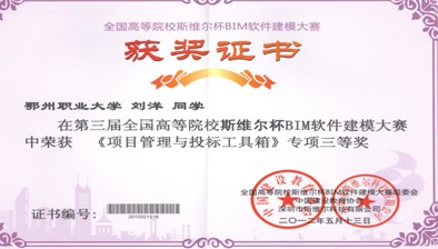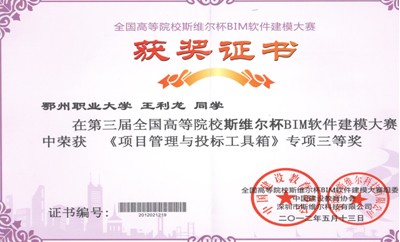 2012年5月11-14日在深圳大学第三届全国高校“斯维尔”杯BIM软件建模大赛现场总决赛,我院“组建的我拼搏,我快乐”团队最终凭借他们的实力及顽强拼搏精神,荣获“团队全能”三等奖、《项目管理与投标工具箱》专项三等奖、《节能设计与日照分析》专项挑战三等奖、学院荣获“优秀组织奖”,参与本次大赛技术指导的教师团队亦被评为“优秀指导教师”。