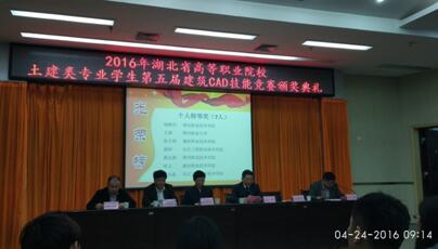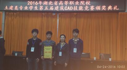 第五届湖北省高职院校土建类专业学生建筑CAD技能竞赛于2016年4月23日上午在武汉长江工程职业技术学院顺利举行,我院建筑设计专业学生王康、郑加斌、何汶林三位同学代表鄂州职业大学参赛,本次参赛的72位选手来自湖北省24所高职高专院校,是全省高职高专院校在职学生中顶级CAD技能高手,我校团队的3位同学经过3个小时激烈角逐,取得了令人瞩目的优异成绩;王康同学获个人特等奖(全省个人总分排名第2)、郑加斌同学获个人一等奖(全省个人总分排名第9)、何汶林同学获个人优秀奖。