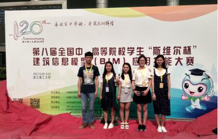 2017年5月20日至21日,第八届全国中、高等院校“斯维尔杯”建筑信息模型(BIM)应用技能大赛在浙江理工大学和吉林建筑大学举行,建筑工程学院学生张倩、叶颖、侯霞、方贵丹和梁青锐组成的参赛团队,在王晓强、张蔚和周耀三位老师的带领指导下,经过激烈角逐,脱颖而出,获得高职组团体全能三等奖、《工程管理专项》二等奖,《工程造价专项》三等奖,《绿色建筑分析专项》三等奖,《工程设计专项》二等奖,共计5个奖项。