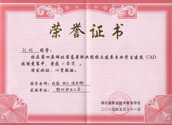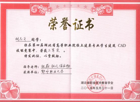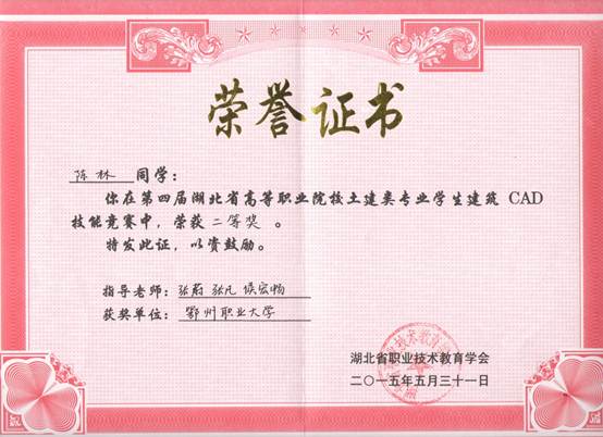 2015年5月30-31日,由湖北省职业技术教育学委员会主办,湖北省土建类专业教学指导委员会协办,湖北省高等职业院校土建类专业学生第四届建筑CAD技能竞赛决赛在湖北水利水电职业技术学院举行。我校由建筑工程学院刘珂、陈林、胡志升三位同学组队,代表鄂州职业大学参加省总决赛。三位选手分别获得个人二等奖、三等奖,并获得团体二等奖。