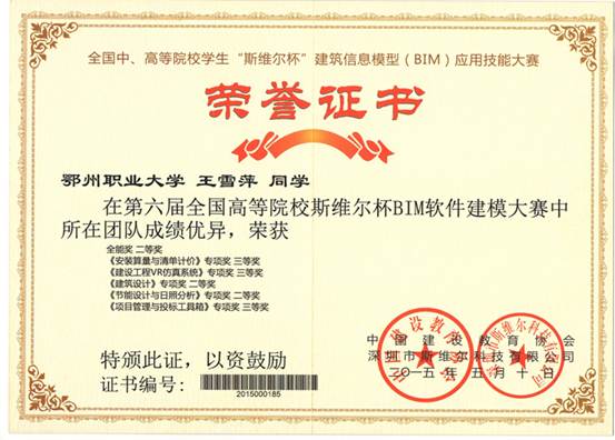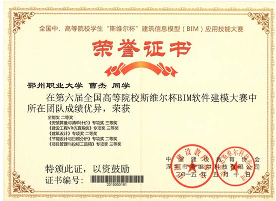 2015年5月9日至10日,第六届全国中、高等院校“斯维尔杯”建筑信息模型(BIM)应用技能大赛在武汉华中科技大学和哈尔滨市哈尔滨工业大学举行,鄂州职业大学建筑工程学院学生曹杰、王雪萍、刘畅、符树飞、陈武斌组成的参赛团队,经过2天的激烈角逐,最终在143所参赛高职院校中脱颖而出,获得佳绩,获得团体全能二等奖、《安装算量与清单计价》专项三等奖、《建设工程VR仿真系统》专项三等奖、《建筑设计》专项二等奖、《节能设计与日照分析》专项二等奖、《项目管理与投标工具箱》专项三等奖,共计6个奖项。