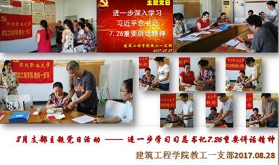 根据学校党委关于在“两学一做”学习教育和支部主题党日的总体部署,为深入学习贯彻习近平总书记7.26在省部级主要领导干部专题研讨班开班式上发表的重要讲话精神,切实发挥领导干部骨干带头作用、党支部战斗堡垒作用和党员先锋模范作用,我院各党支部于8月28日下午开展了“深入学习习近平总书记7.26重要讲话精神”支部主题党日。