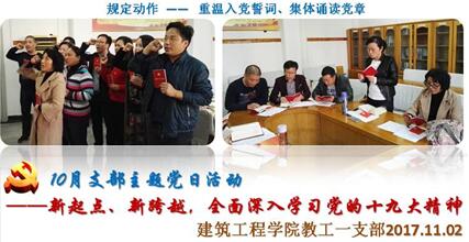 各支部主题党日按照“3+X”(重温入党誓词、集体诵读党章、自觉缴纳10月党费等3个规定动作+若干自选动作)的方式进行,支部书记带头学习解读“十九大报告”新思想、新亮点;集中学习观看了央视制作播出的“十九大宣讲”视频,各支部围绕近期学习心得,结合自身实际,开展主题研讨。