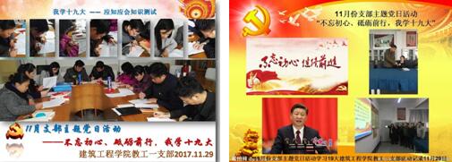 各支部主题党日按照“3+X”(重温入党誓词、集体诵读党章、自觉缴纳11月党费等3个规定动作+若干自选动作)的方式进行,支部书记带头学习解读“十九大报告”新思想、新亮点;集中学习观看了“十九大精神宣讲”视频,各支部围绕近期学习心得,结合自身实际,开展主题研讨。并组织了党的十九大知识测试。