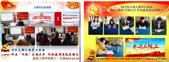各支部主题党日按照“3+X”(重温入党誓词、集体诵读党章、自觉缴纳12月党费等3个规定动作+若干自选动作)的方式进行,支部书记带头学习党的十九大精神;集中学习《纠正“四风”不能止步 作风建设永远在路上》,各教工支部书记结合《纠正“四风”不能止步 作风建设永远在路上》为本支部党员讲授关于纠正“四风”不能止步的党课,并围绕近期学习心得,结合自身实际,开展主题研讨。