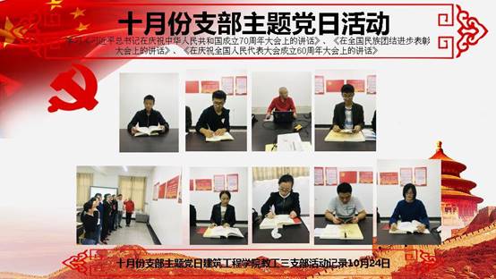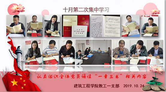 各支部主题党日活动按照“3+X”(重温入党誓词、集体诵读党章、自觉交纳党费等3个规定动作+若干自选动作)的方式进行,17日支部书记带头学习了《党章》、《习近平新时代中国特色社会主义思想学习纲要》、《中国共产党重要党内法规学习汇编》、《习近平关于“不忘初心、牢记使命”论文摘编》等一章三书的部分内容;24日重点学习了《习近平总书记在庆祝中华人民共和国成立70周年大会上的讲话》、《在全国民族团结进步表彰大会上的讲话》、《在庆祝全国人民代表大会成立60周年大会上的讲话》精神和陈希、王沪宁在“不忘初心、牢记使命”主题教育推进会上相关的讲话精神。