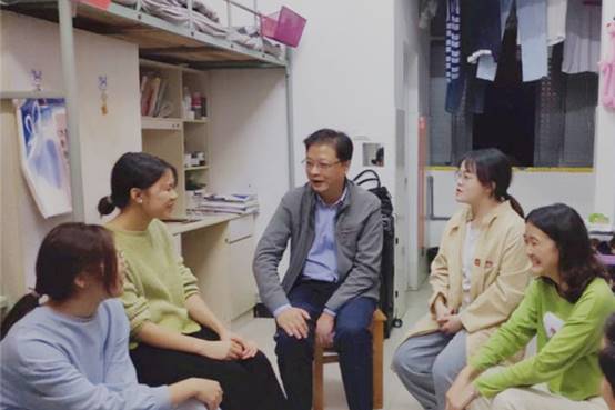 随后,万国光又来到联系的学生宿舍w410寝室,与同学们亲切交谈,面对面地聊家常、聊大学生活。他详细询问了同学们的日常学习和生活情况,就同学们适应大学生活情况、文明宿舍建设、课程学习等方面存在的问题和困惑进行了探讨解答。