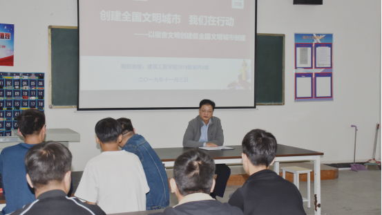 根据校党委“六个一工程”部署,扎实推进“不忘初心、牢记使命”主题教育,11月3日晚,校党委书记万国光率校办、组织部、宣传部、学工处等相关部门,专程来到我院深入联系我院2018级室内三班和学生宿舍,全程参加并指导该班的《创建全国文明城市 我们在行动》主题班会活动,了解学生学习和生活情况。