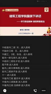 2020年5月11日早上7时,教工一支部联合学生党支部组织我院19级300多名同学,在家中通过电脑、手机进行“线上升旗仪式”。学院党总支支委,教工一支部、学生党支部党员、辅导员和2019级全体同学,一起参加本次活动。