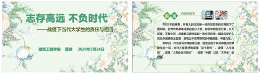 6点55分,19级同学纷纷上线,晚上7点,班会正式开始,霍老师首先请一位学生代表谈了她在疫情期间的感受,由此展开了战疫下当代大学生的责任与担当的大讨论,班会上,首先通过图片回顾了疫情期间那些令人难忘的时刻,同时还介绍了抗疫战斗中的鄂大学子和建工骄子,展示了19级部分同学几个月来线上认真学习的身影和成果,随后进行了大三及毕业多年的师兄师姐们的视频连线。班会最后霍老师带领全体同学宣读誓词“我愿披荆斩棘,磨砺成自己的榜样!”。
