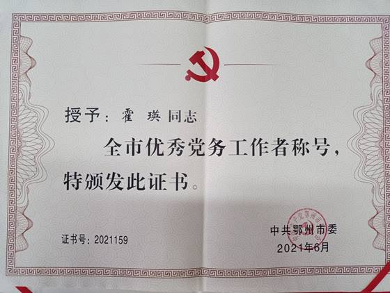 7月2日,在鄂州市“两优一先”表彰大会上,鄂州职业大学建筑工程学院第一教师党支部书记霍瑛被授予“优秀党务工作者”荣誉称号。