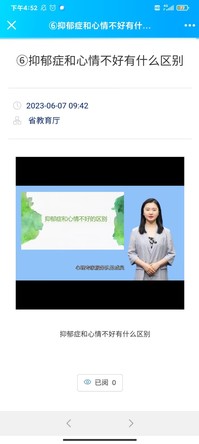 学生篇涵盖了心理咨询和聊天的区别、抑郁和心情不好等10个部分。通过学习,使得学生对日常心理分辨和调整有了进一步认识。